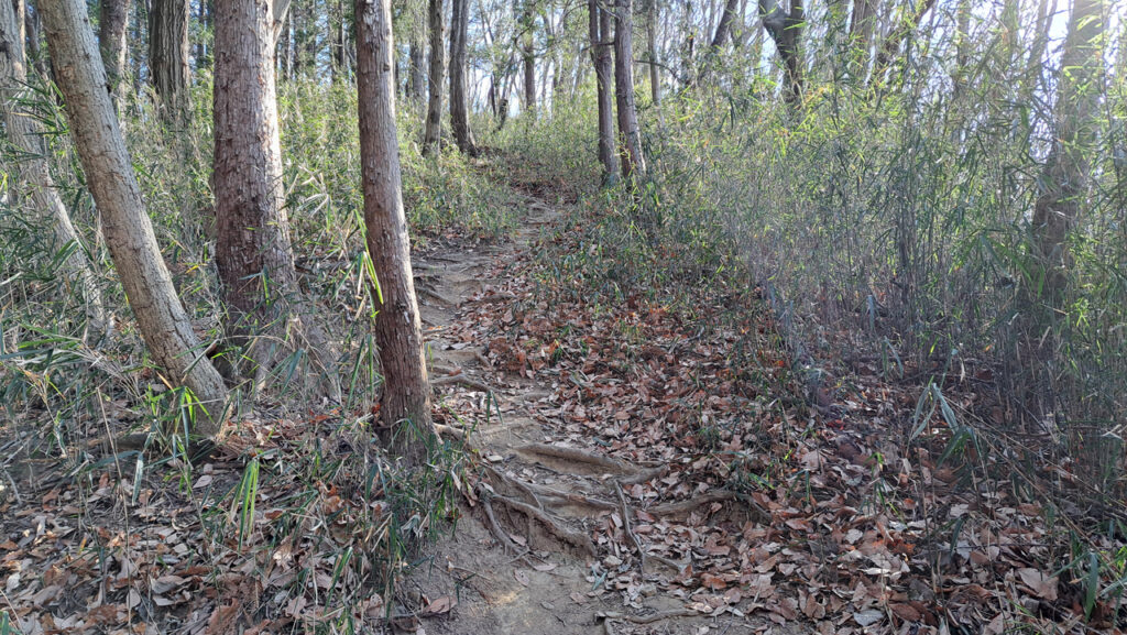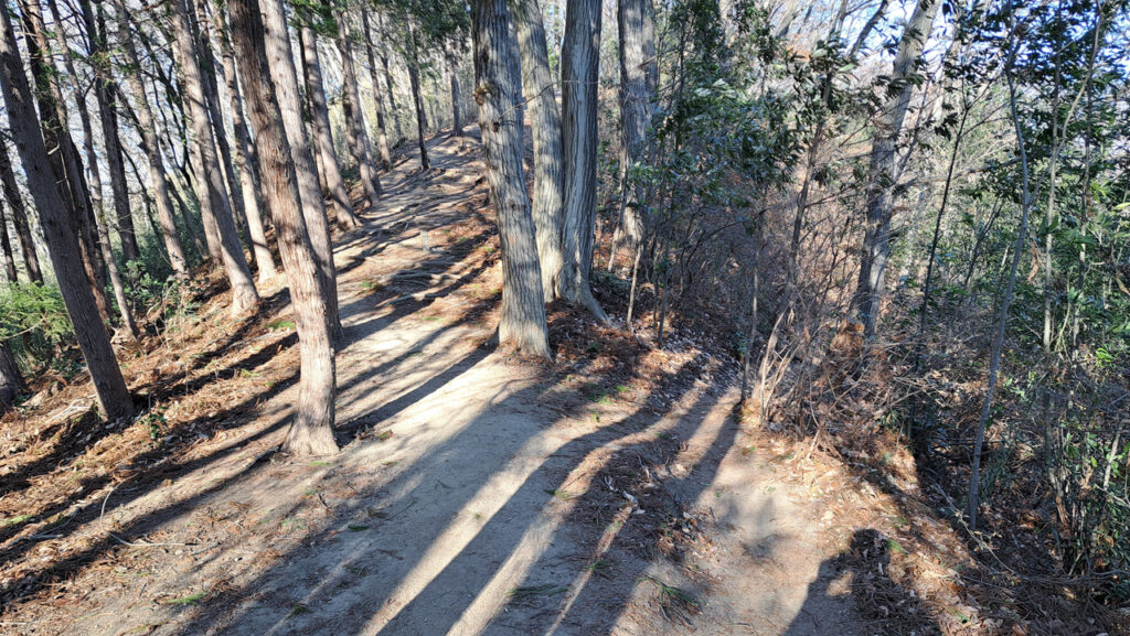 落ち葉は多いですが、走りやすい道が続きます。傾斜もそれほど急ではありません。下りルートとして走る場合は、一気に走っていけます。